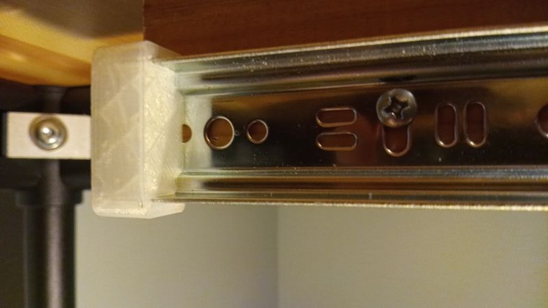 This little part is a backstop for the Knape & Voght 1300 Series drawer slides. It can be attached to the end of either rail to prevent the drawer from being able to slide past the end and drop the bearing roller out of the channel.